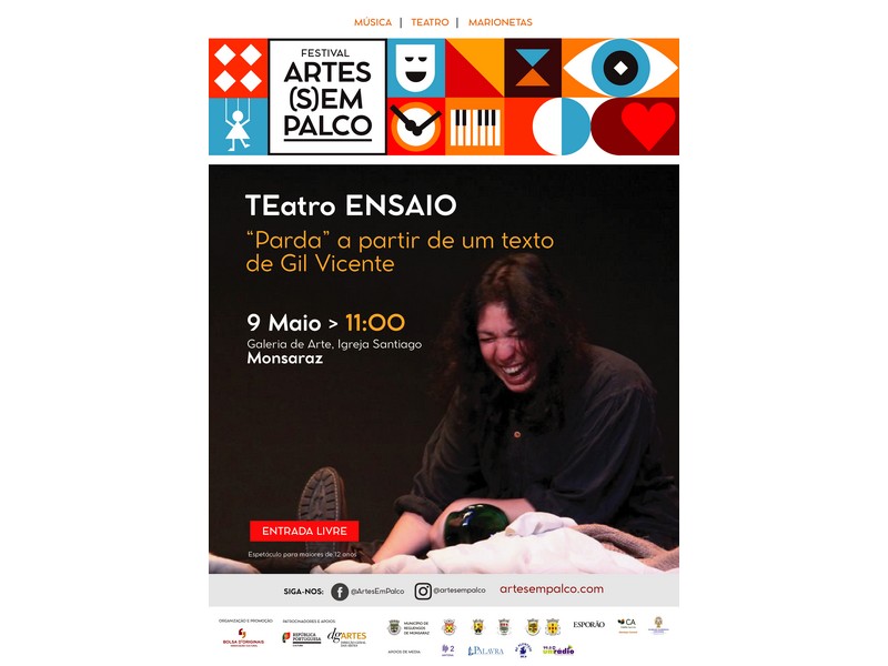 No dia 9 de maio, na Galeria de Arte, Igreja de Santiago, em Monsaraz, será apresentado o primeiro espetáculo da primeira edição do Festival Arte(S)em Palco, com o teatro “Parda”, pelo TEatroensaio, a partir de um texto de Gil Vicente, promovido pela Bolsa D’Originais – Associação Cultural. A mesma peça irá ser reproduzida no dia 16 de maio, às 11h, no Centro Cultural Caridadense 1.º de Maio, na aldeia de Caridade. De maio a outubro o público poderá assistir a 15 concertos, espetáculos de teatro e de marionetas, espalhados por 14 vilas e aldeias do concelho de Reguengos de Monsaraz.
