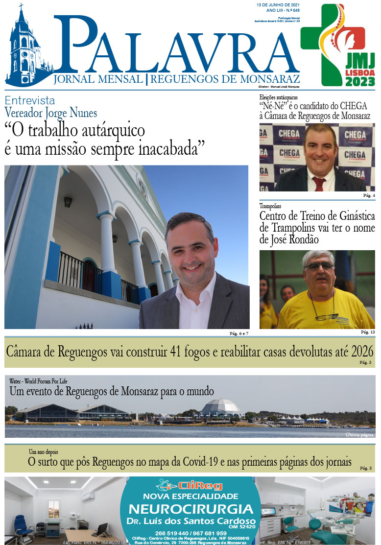 Jorge Nunes e José Rondão abrem a primeira página do Jornal PALAVARA na edição de junho 2021. Jorge Nunes, Vereador da Câmara de Reguengos de Monsaraz dá uma entrevista em final de mandato. Um balanço que considera positivos, ainda que a missão seja sempre inacabada. José Rondão, vai ter o nome no pavilhão do Centro de Treinos de Ginástica de Trampolins. Há muito que a cidade lhe deve este reconhecimento pelo trabalho de anos, sempre com bons resultados, que se impõe depois do título de Vice-campeã atribuído a Margarida Carreiro. As páginas centrais e a página do desporto oferecem aos leitores toda a informação disponível.