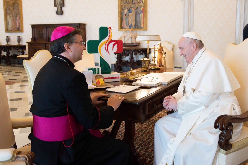 Pelas mãos do Bispo auxiliar de Lisboa DD. Américo Aguiar, presidente da Fundação JMJ Lisboa 2023, o Papa Francisco recebeu na passada quinta-feira os símbolos da Jornada Mundial, o logotipo em madeira e o terço.